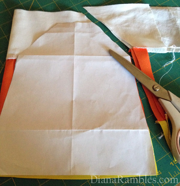 I started out by making the pattern below and folding it where I thought the color stripes should go. Then I sewed together the white, orange, & yellow strips of fabric. I ironed the serged seams toward the orange since it was the darkest color.