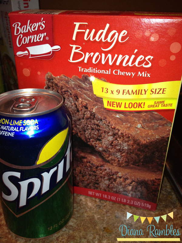 The other day I tasted some egg-less brownies that a friend made with diet coke. They were very cake-like but with some chewiness. We had a Sprite on hand so we decided to try it out. All you need is 2 ingredients: a can of soda and a brownie mix.